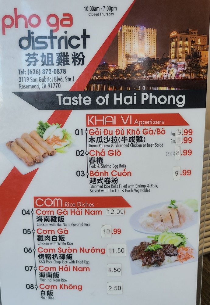Pho Ga District is a local gem specializing in authentic Vietnamese chicken dishes. Their menu offers a variety of options, from steamed boneless chicken with rice to flavorful pho ga made with medium wide rice noodles. The reviews rave about the quality and freshness of the food, particularly highlighting the perfectly cooked chicken and the lightness of the broth. Regulars love the friendly vibes of the restaurant and the quick and attentive service provided. Whether you're looking for a comforting bowl of chicken noodle soup or a satisfying chicken rice plate, Pho Ga District is the go-to spot. Don't miss out on their Vietnamese coffee or Thai tea for a perfect pairing with your meal. With options for takeout, delivery, and catering, this family-owned establishment is a must-visit for delicious and authentic Vietnamese cuisine.